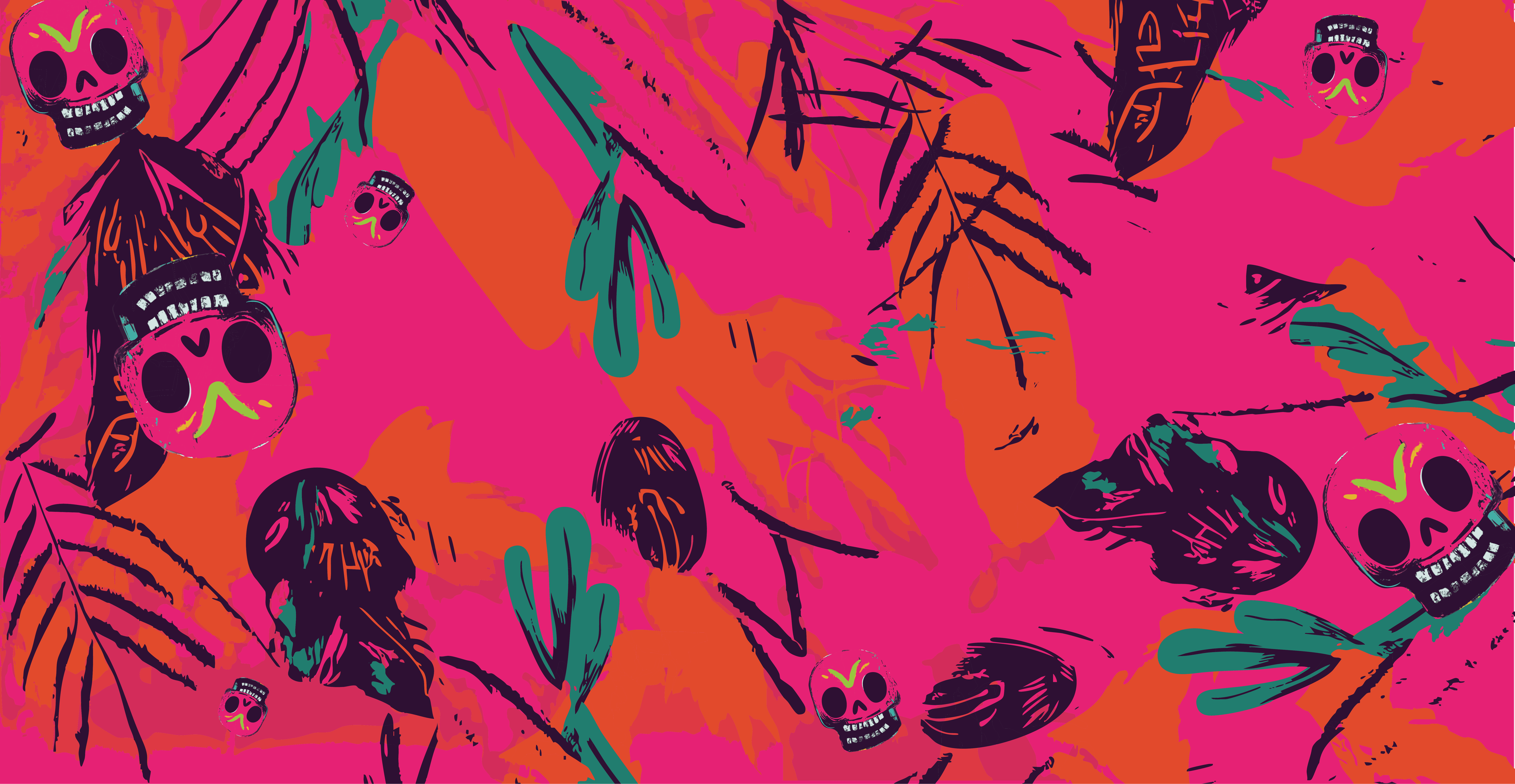 The colour system is bold and energetic — neon pinks, oranges, greens, and deep contrast tones drive visibility and vibrancy across environments. These hues reference traditional Day of the Dead celebrations and Mexican street art sensibilities, while still feeling contemporary.